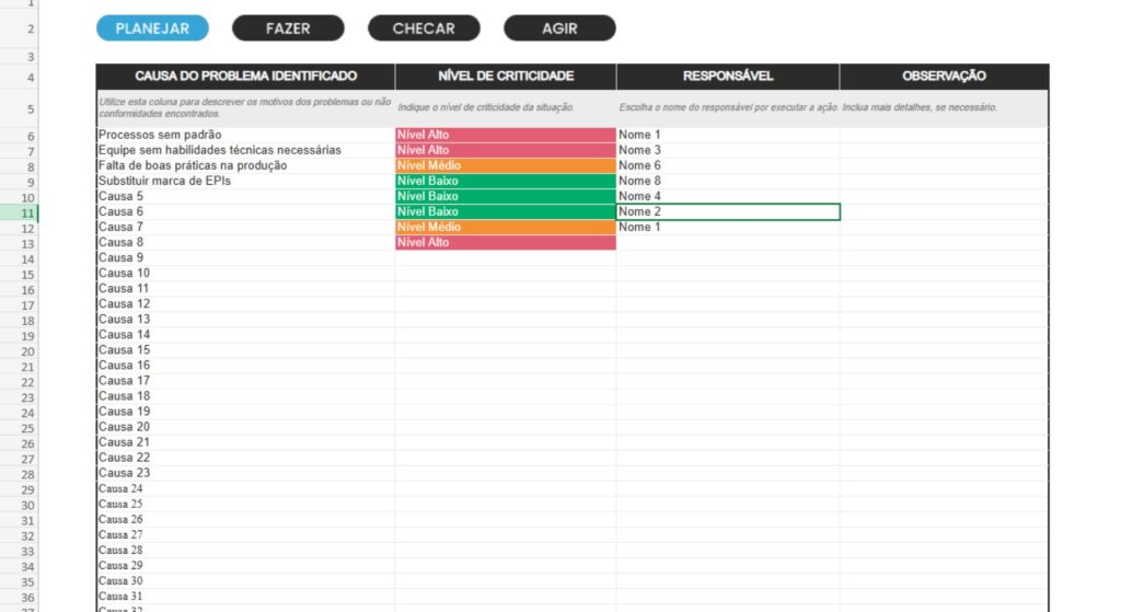 Modelo customizável para Ciclo PDCA