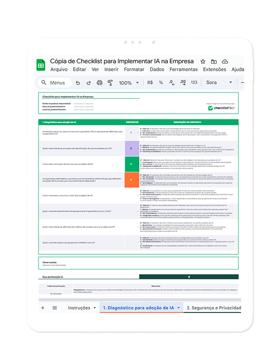 Pensando em tudo isso, nosso checklist não apenas guia você na implementação, mas também oferece diretrizes essenciais para mitigar esses desafios. Com ele, você seguirá requisitos indispensáveis para amparar o uso da IA na sua empresa.