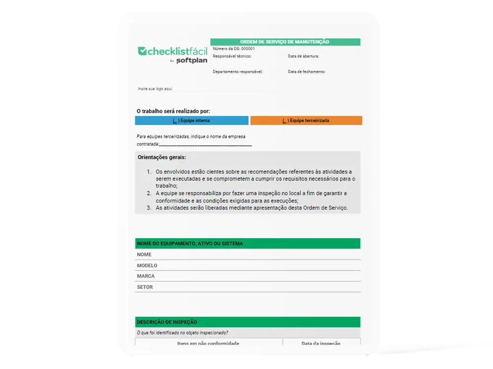 Entre as principais informações que não podem faltar em uma Ordem de Serviço de Manutenção, estão: